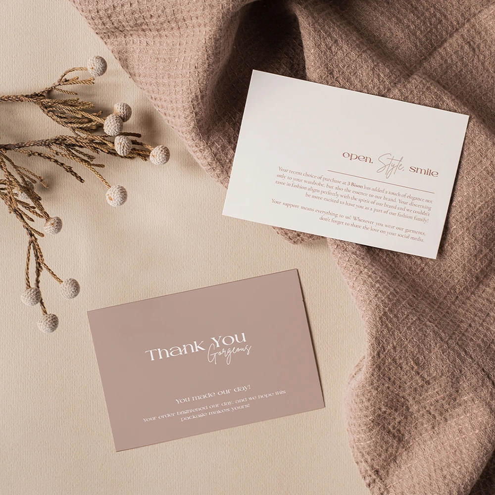 We built a cohesive brand identity for 3 Bison that celebrates modern femininity with strength and resilience. The bison horn logo reinforces this bold essence, while our print materials – including sleek hang tags, thank-you cards, and practical offer coupons with QR codes – enhance the customer experience. Additionally, the eco-friendly packaging uses minimal plastic and features a luxurious red-and-gold design, ensuring an impactful and thoughtful unboxing experience.